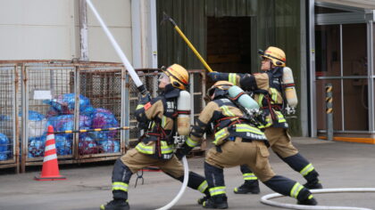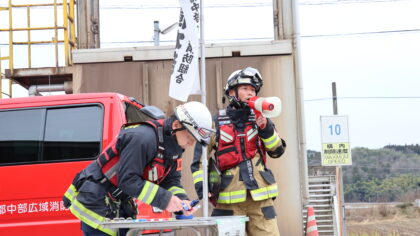 訓練は、工場内の倉庫から出火し、付近に延焼拡大中との想定で、工場従業員による119番通報、初期消火、避難誘導が行われ、消防署は、指揮隊による現場指揮のもと、消防隊が逃げ遅れの救出や消火活動を行いました。